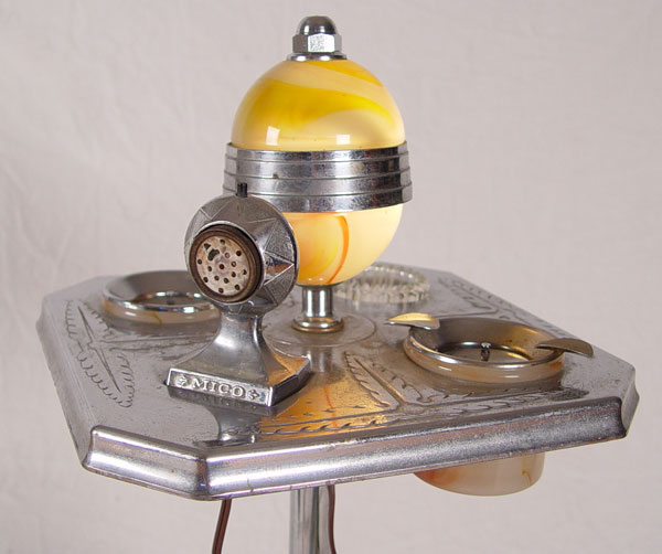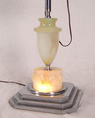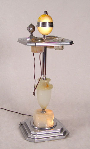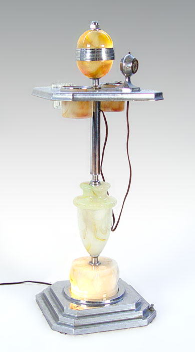 CHROME & AGATE ART DECO SMOKING STAND: Electric with light on base and top. 2 ashtray, glass cigarette holder and electric lighter inserts, unsure of working condition on lighter. Note condition of chrome. Please note middle amber has cracked section, held in by weight of top section. Measures 30'' high x 11 1/2'' square base.