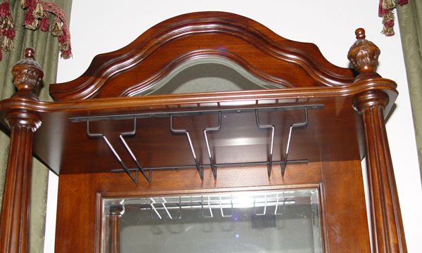 CONTEMPORARY CARVED MAHOGANY WINE CABINET: Mirror back, with stemware rack, drawer, wine shelf behind the glass door. Side doors door extra storage. Measures 71'' high x 32 1/2'' wide x 18 1/2'' deep.