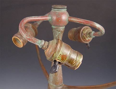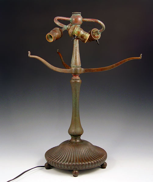 TIFFANY STYLE LAMP BASE: Marked underneath base ''Tiffany Studios New York 374'', bronzed metal. 3 light with fluted column and base. Measures 21'' high x 13'' dia.