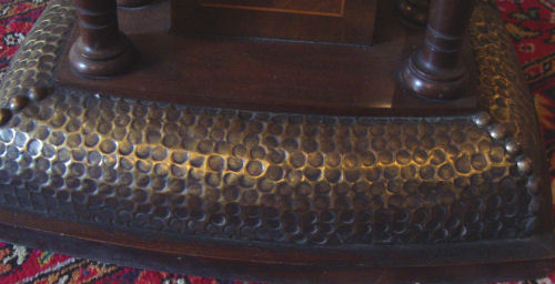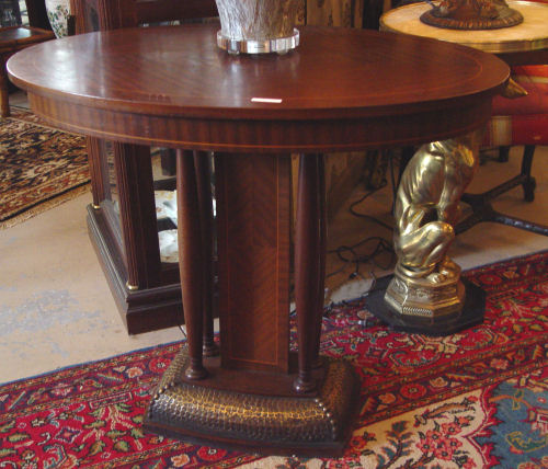 ART DECO MAHOGANY AND HAMMERED METAL SIDE TABLE: Oval top, string inlay, single pedestal column, base clad in hammered metal. Measures 30'' high x 35'' wide x 24'' deep. Note wood worm holes
