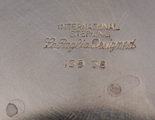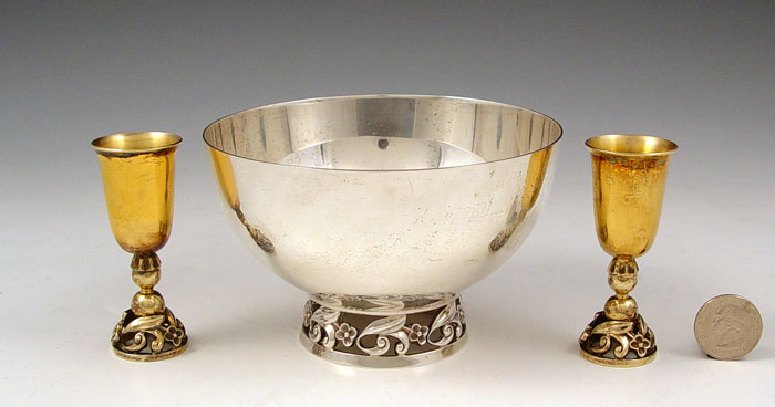INTERNATIONAL LA PAGLIA STERLING BOWL & CORDIALS: La Paglia design for International center bowl. Measures 3 1/8'' high x 5'' dia.. 2 vermeil sterling cordials. Measure 3'' high x 1 1/8'' base dia. Approx. 10.4 troy oz.