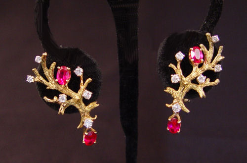 RUBY & DIAMOND EARRINGS: 14K yellow gold branch motif earrings contain 12 round brilliant cut diamonds, approx. .75 ct., rated VS in clarity and G-H in color. There are also 4 oval shaped synthetic rubies. All stones are prong set. Post and hinged clip closures. Weight: 9.5 grams. Approx. 1 ½'' in length.