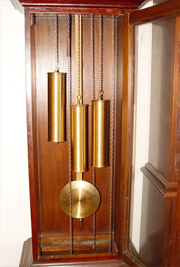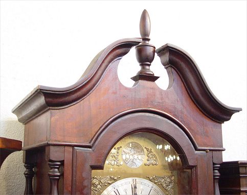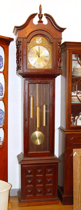 TEMPUS FUGIT MOONPHASE GRANDFATHER CLOCK: Metal face with putti decoration on 4 corners. Solid wood case. Weight driven mechanism. Note repairs to bonnet, finish loss on brass weights. 91'' high x 23'' wide x 13'' deep