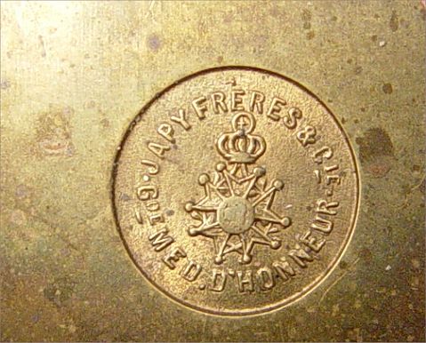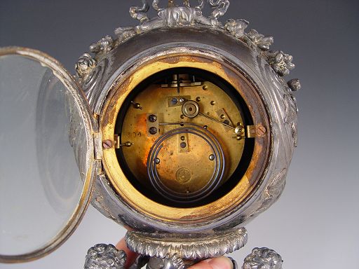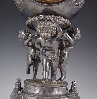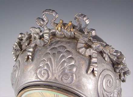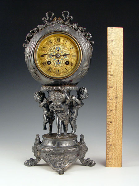 ART NOUVEAU JAPY FRERES CHERUB CLOCK: Silverplate over metal case with 3 putti on footed base supporting decorated globe form case. Garland decoration top of case, note missing bird finial. Gilt metal face with enamel decoration, roman numerals. Marked on key wind with Japy Freres medallion, note no key or pendulum. Please note nearly all of silverplate has been removed due to poor cleaning at some point. Measures 13 1/2'' high x 6'' wide x 5 1/2'' deep.