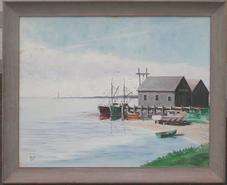 WELT, Milton, (American, 20th C): Harbor scene with boats, OIL/Canvas Board, 22'' x 28'', painted wood frame 26'' x 32''.