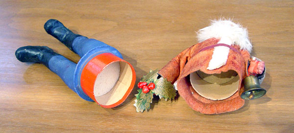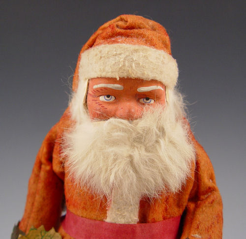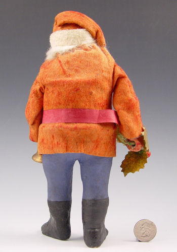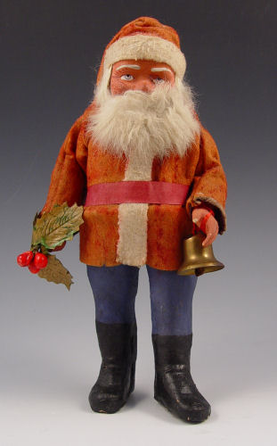 VINTAGE SANTA CLAUS CANDY CONTAINER: Germany, 10 1/2'' h. Cloth jacket and hat. Hand painted composition face, legs and boots, rabbit fur beard. Separates at the waist for candy container. Holding a bell in one hand, a holy sprig in the other.