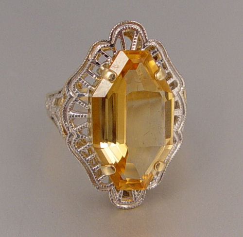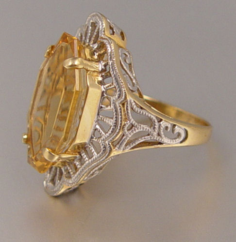 14K FILIGREE RING WITH 10 CT CITRINE: 14K yellow gold ring contains one geometric shaped faceted citrine. Weight: 10.00 Ct. Approx. Rated VVS in clarity (Type II), Y (brown modifier) in Hue, 2 in tone and 2 in Saturation. The stone is prong set. Filigree ring with rhodium. Weight: 7.5 grams. Size 7.