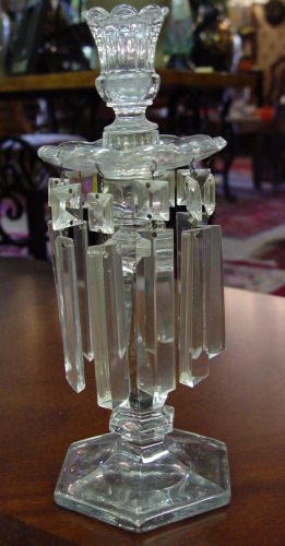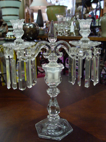 HEISEY 3 PIECE CANDELABRA: A 2 light candelabra with prisms, and the matching pair of single light candle holders. The candelabra alone bears the Heisey hallmark. Please note shallow chip on bobeche of a single stick. 16'' and 12'' tall.