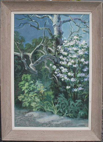 MODERNIST OIL ON CANVAS SIGNED J. FRASER: Forrest Study with blossoming trees, 36'' x 24'', antiqued barn wood style frame, 43'' x 31''.
