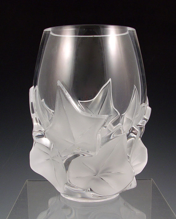 LALIQUE FRENCH CRYSTAL VASE: Frosted ivy leaves cover the base. 6 1/4''h. Signed Lalique France.