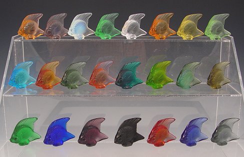 23 LALIQUE GLASS FISH FIGURES: Assorted colors including opalescent & clear. Each measures 1 7/8'' high. Note chip on fin of clear one.