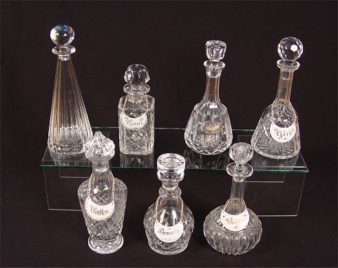 COLLECTION OF 7 CUT CRYSTAL DECANTERS: As pictured clockwise from top left to include 1) Villeroy & Boch Paloma Piccaso fluted, 12 3/4'' high x 4 3/4'' base dia.. 2) Val St Lambert, note rim chip, 9 1/8'' high x 3 1/4'' base dia. 3) Atlantis, 11'' high x 4 1/2'' base dia. 4) Waterford, 12'' high x 5 1/8'' base dia. 5) Unsigned, 11'' high x 5'' dia. 6) Unsigned, note large chip to stopper, 9 1/2'' high x 4 1/8'' dia. 7) Unsigned, note rim chips, 12 1/2'' high x 4 1/4'' wide. Please note all have base scratches, measured to top of stopper, some stoppers may be replacements.