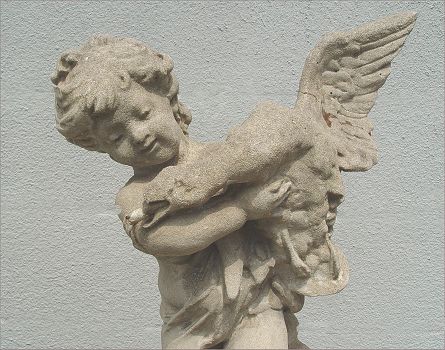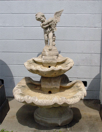 OLD 2 TIER ANTIQUE CEMENT FOUNTAIN: 2 tier shell form basins with child and swan fountain. Note chips to beak and several cracks to wings. Unsure of working condition of pump. Overall measures 59'' high x 37 1/2'' wide x 38 1/2'' deep.