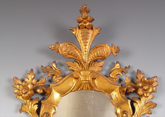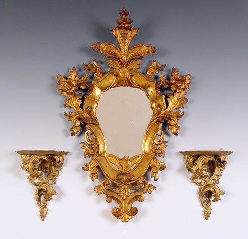 CARVED GILT WOOD MIRROR WITH SCONCES: Carved gilded wood mirror. Comes with pair of gilded wood sconces. Please note sconces do not match mirror. Mirror measures 26'' high x 17'' wide x 4 1/2'' deep. Sconces measure 8 1/2'' high x 6 3/4'' wide x 3 1/2'' deep.