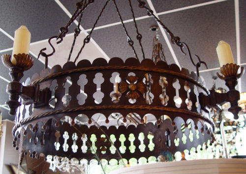 CASTLE STYLE IRON CANDLE CHANDELIER: Pierced metal ring holds 4 candle, non electric. Measures 46'' high x 34'' dia.