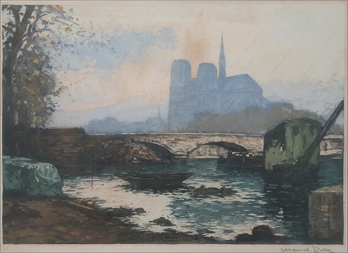 ROBBE, Manuel, (French, 1872-1936): European Canal Scene, Etching/Aquatint, sight size 13 1/2'' x 18 1/2'', pencil signed lower right, #'d lower left 305, encased in painted frame with minor wear, 20'' x 24 1/2''. Condition - Overall toning and acid burn through in several areas, not examined out of the frame.