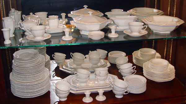ROSENTHAL ''MARIA'' FINE CHINA SERVICE: 89 pieces to include 11 dinner plates, 12 salad plates, 7 bread plates, 8 soup bowls (note one chipped), 6 dessert bowls, 12 cups and 12 saucers, nest of 3 serving bowls, 3 graduating serving platters, 4 butter pats, gravy boat, covered sugar, creamer, 2 sets candle holders, toothpick holder, 2 ashtrays, and a cigarette holder.