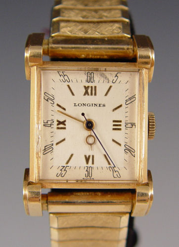 LONGINES 14K GOLD ART DECO WRISTWATCH: Solid 14k yellow gold case. Case is rectangular, measures 21mm wide and 35mm long. Watch features extra fancy Art Deco fluted lugs. Crystal is a thick rock style with extra high dome. Case is heavy and extremely fine condition with factory original satin finish and patina on case back. Dial is in good condition, showing only minor ageing. Watch runs well and keeps excellent time. The watch case is signed, as well as the dial and movement, making this is a triple signed watch. The movement is a caliber 8NS with 17 jewels in extremely clean condition.