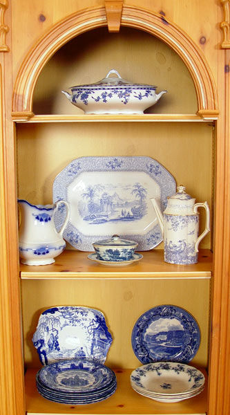 ESTATE LOT OF FLOW BLUE: pieces to include Royal Crown Derby Chocolate pot (spout chip), Delph pattern covered vegetable, 6 Waverly dinner plates, 4 Dunbarton soup bowls, transferware platter in the Corinth pattern, Views of Salt Lake City and Washingtons Headquarters, canton type covered sauce dish, and a Lorne water pitcher (hairline).