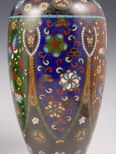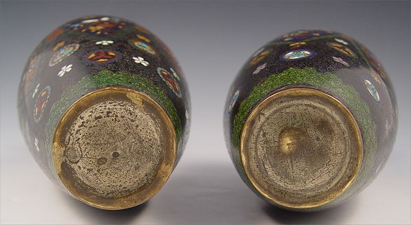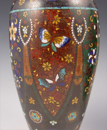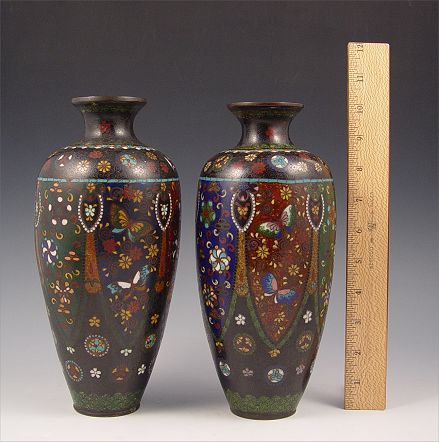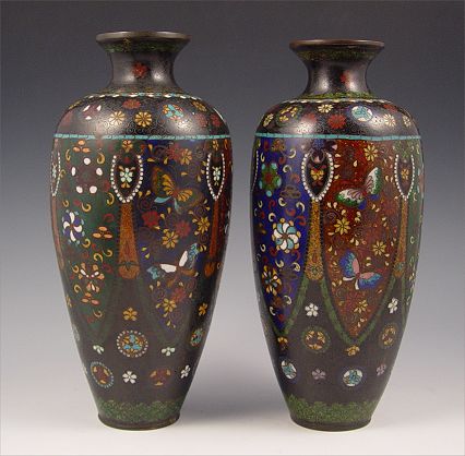 PAIR CLOISONNE VASES: Detailed design of butterflies and medallions, ginbari panels, 10''h.