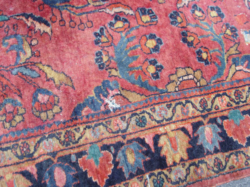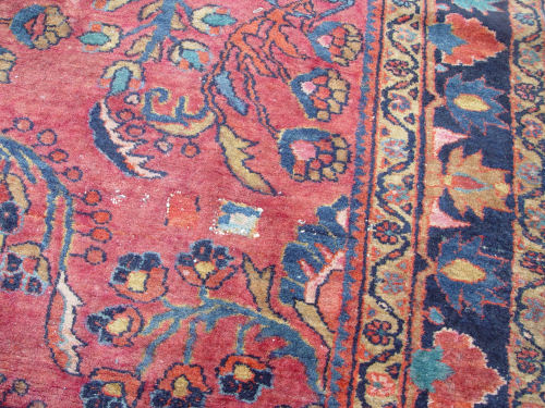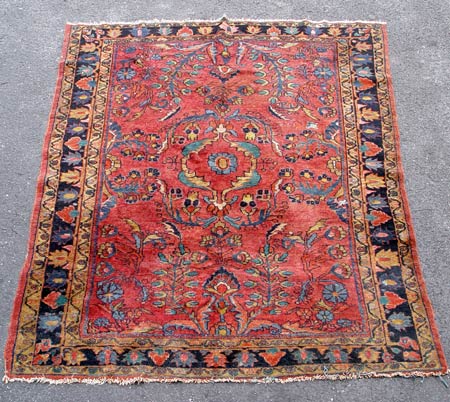 SEMI ANTIQUE LILLIHAN RUG RED FIELD WITH MEDALLION: Measures apparox. 6' 5 1/2'' x 5' 1 1/2''. Note repairs, wear to edges.
