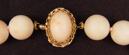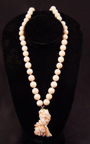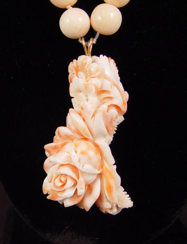 ANGEL SKIN CORAL BEADS & CARVED CORAL PENDANT: 14K yellow gold clasp contains one oval shaped 14.00 x 10.00 mm cabochon cut piece of coral. 24'' necklace of 11.50 - 12.00 mm angel skin coral beads. The chrysanthemum motif carved pendant is approx. 65.00 x 30.00 mm.
