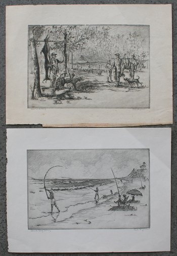HAGERMAN, Kent, (American 1893-1978): Two Dry Point Etchings, 1) ''Meat in the Camp'', 9 3/4'' x 13 1/4'' with margins, pencil signed and titled, signed in the plate. Condition - Diagonal crease in right corner, scattered foxing, lower left corner is crease and lower margin is stained. 2) ''Florida Surf Fishing'', 10'' x 13'' with margins, pencil signed and titled. Condition - Crease in upper right margin and minor crease in lower left margin, very faint foxing in the margins. Neither piece is framed, sold as is.