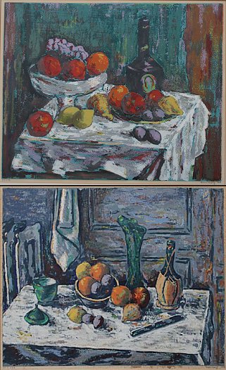 SHOULBERG, Harry, (American,, 1903-): Pair Serigraphs, sight size 13 3/4'' x 17'', signed lower right, dated 44 and 45, matching wood frames, 21 1/2'' x 25 1/2''. Condition - Some discoloration to margins, images appear unaffected.