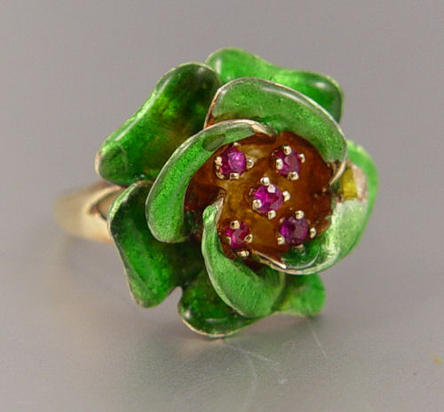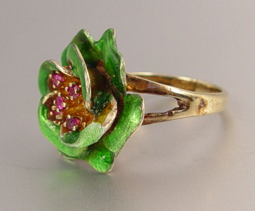 ROSE FORM 18K ENAMEL AND RUBY RING: 18K yellow gold ring depicting a rose in green enamel. 5 round mixed cut rubies. Weight: .40 Ct. Approx. The rubies are prong set. Some chips in enamel. Weight: 9.0 grams. Size: 6