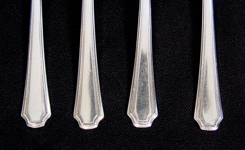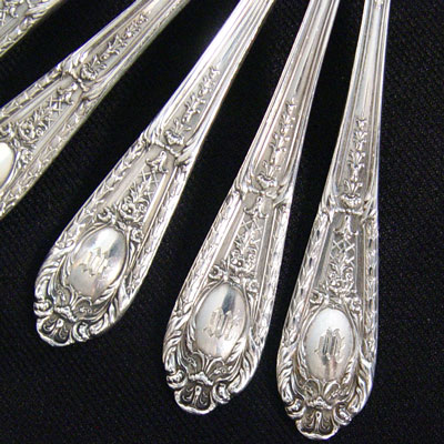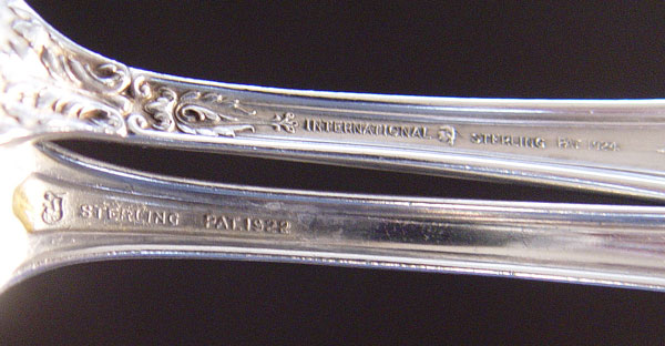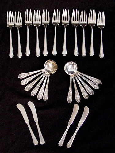 ESTATE STERLING FLATWARE INTERNATIONAL, TOWLE: To include 12 soup spoons (5 1/2'') in the Fontain pattern by International Sterling, monogrammed ''W''. 11 salad forks (6 1/4''), 4 solid butter knives (5 7/8'') in the Lady Constance pattern by Towle, no monograms. Approx 24.7 troy oz.