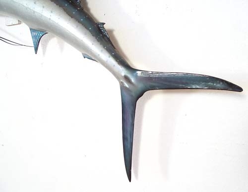 SAILFISH MOUNT 7 FT. LONG: Catch and release fiberglass form realistic sailfish. Approx 7' long tail to tip of bill. Note repair to fin.
