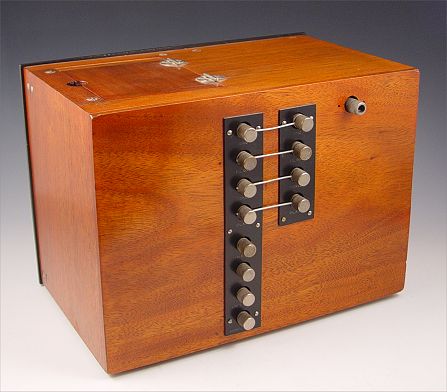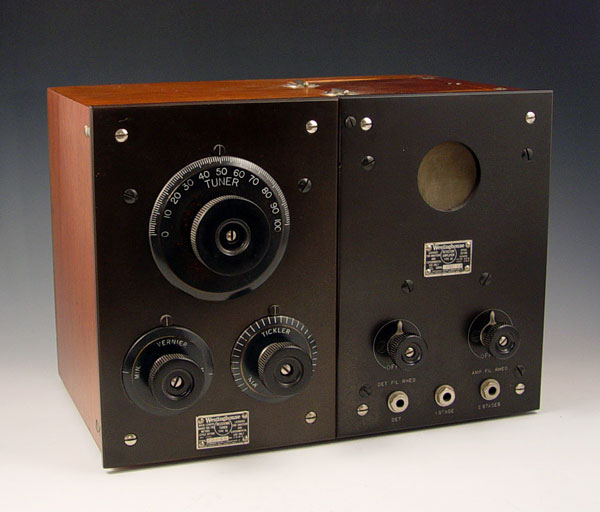 1920'S WESTINGHOUSE RA / DA RADIO: Solid single wood case with metal front. All original knobs. RA serial number 22245, DA serial number 39834. Unsure of actual working condition, no tubes. Measures 9 7/8'' high x 13 1/8'' x 8 1/4''.
