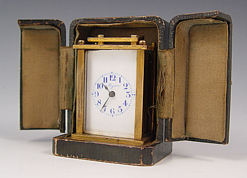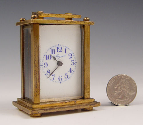 FRENCH MIGNON CARRIAGE CLOCK WITH WOOD CASE: Diminutive clock by Mignon with brass case and beveled glass on 3 sides. Wind mechanism. Comes with original wood protective case with green leather cover. Clock measures 2 3/4'' high x 2'' wide x 1 1/2'' deep. Case measures 3 1/2'' high x 2 1/2'' x 1 7/8''. Note finish on brass, rubbing to leather on case.