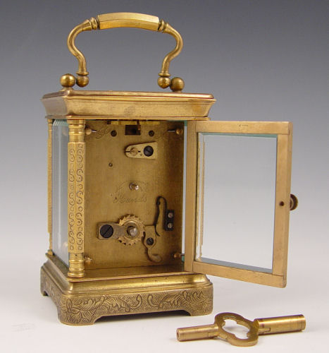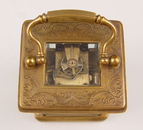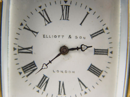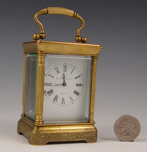 ENGRAVED ELLIOTT & SON LONDON CARRIAGE CLOCK: Engraved brass case with beveled glass on all 4 sides and top. Key wind mechanism, works marked Made in France. Marked on face Elliot & Sons London. Note actual age unknown. Measures 3 1/2'' high x 2 1/2'' wide x 2 1/4'' deep.