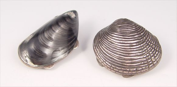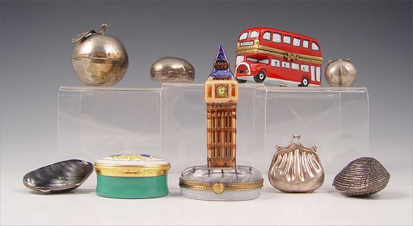 COLLECTION OF 9 SILVER & PORCELAIN PILL BOXES: To include 1) Tiffany & Co. Italy sterling clam shell form. 1 5/8'' long. 2) Enamel & sterling Italian mussel shell form, note loss of enamel. 2'' long. 3) Sterling purse form with chain. 1 1/2'' wide. 4) Silverplate nut form. 1 3/8'' wide. 5) Silverplate nut form. 7/8'' wide. 6) Silverplate plum form. 1 3/4'' high 7) Halcyon Days designed by Tiffany & Co. porcelain for the Tiffany Ball 1988. 1'' high x 2'' wide. 8) Sinclair Limoges porcelain double decker bus form, limited edition 5/750. 1 3/4'' high x 3 1/2'' long. 9) Sinclair Limoges porcelain ''Big Ben'' form, limited edition 76/750. 4 1/8'' x 2 1/4''.