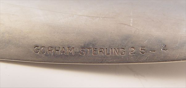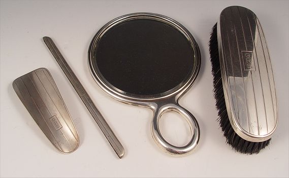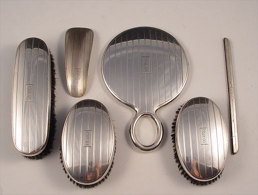 6 PIECE GORHAM STERLING VANITY SET: To include 2 oval hand brushes (5'' x 3 1/8''), bar brush (7 1/4'' x 2 1/4''), mount for comb (7 1/2'' note missing comb), hand mirror (8 1/8'' x 5 1/2''), shoe horn (4 3/4'' x 1 3/4''). Monogrammed.