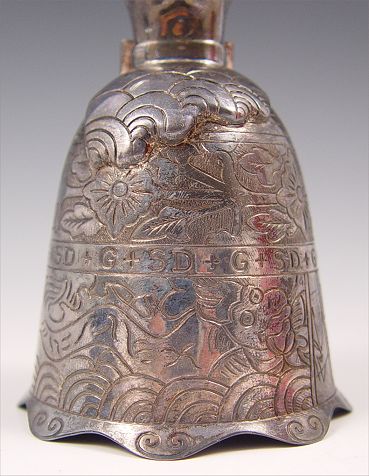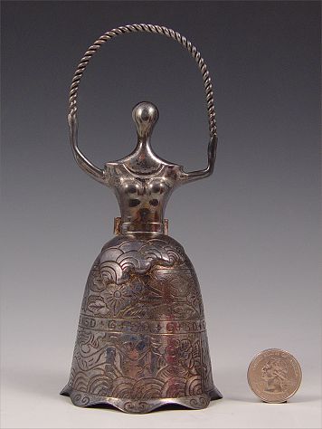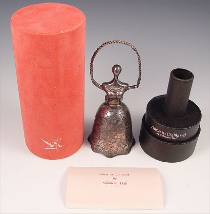ALICE IN DALILAND STERLING BELL: Limited edition by the Lincoln Mint #521 titled ''Alice in Daliland'' designed by Salvador Dali. Comes with original COA and protective case. Bell measures 6 3/4'' high. Case measures 9 1/2'' high x 3 1/2 dia. Approx 7.2 troy oz.