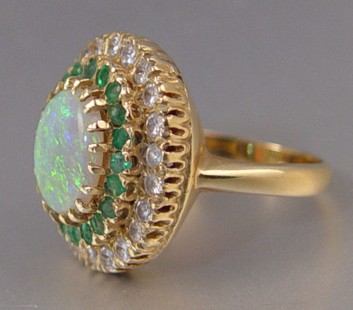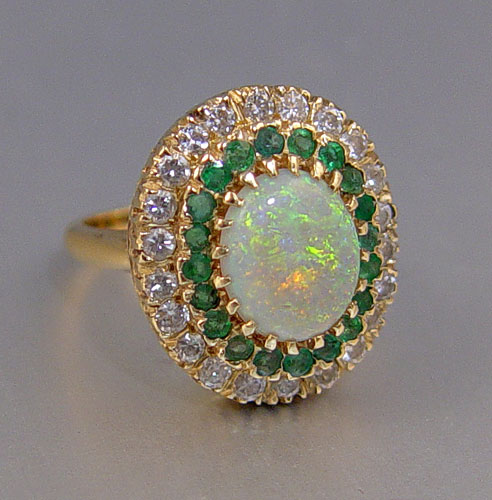 OPAL, DIAMOND AND EMERALD RING: 14K yellow gold ring centering an approx. 1.65 cabochon cut opal. Semi-crystal, translucent transparency, rolling flash-fire pattern. Circled by 29 round mixed cut emeralds, approx. .40 Ctw., rated SI in clarity, G hue, 4 tone and 3-4 saturation. A second circling of 22 round brilliant cut diamonds, approx. 1 Ctw., rated VS-SI in clarity and H color. 9.8 grams. Size 7. Sold with the Sold with current Florida Diamond Appraisers GIA graduate's appraisal for 3,295.