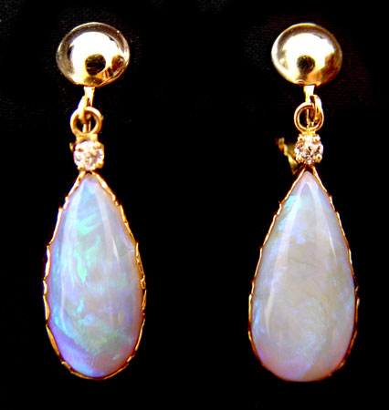 14K OPAL & DIAMOND DROP EARRINGS: 14K yellow gold earrings contain 2 20.00 x 9.00 mm pear shaped cabochon cut semi-crystal opals. Weight: 8.00 Ct. Approx. Grey body-color, blue/green/violet play-of-color. Both opals are crazed. 2 old European round cut diamonds. Weight: .20 Ct. Approx. Rated SI in clarity and H in color. The diamonds are prong set. The opals are bezel set. Hinged clip closures. Weight: 6.0 grams.