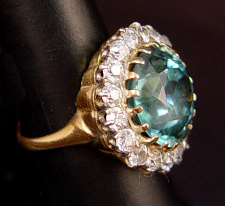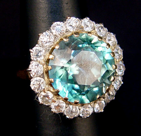 17 CT ZIRCON RING CIRCLED BY DIAMONDS: 18K yellow gold ring centering a round mixed cut zircon, approx. 17.12 ct., 14.55 mm - 14.62 mm. Rated VVSI clarity, slgB hue, 3-4 tone, 3 saturation. Surrounded by 17 old European round cut diamonds and 1 round brilliant cut diamond, approx. 2.5 ctw. Diamonds average VSI-VS2 in clarity and H in color. All stones are prong set. Weight is 13.4 grams. Size 8. Sold with current Florida Diamond Appraisers GIA graduates appraisal for $8250.