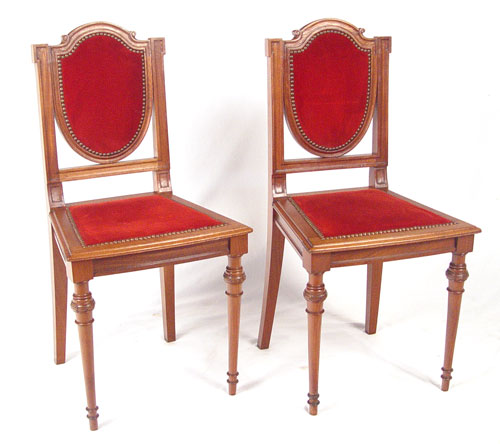 SET OF 8 EARLY 20TH C FRENCH DINING SIDE CHAIRS: Red velvet covers the seats and cartouche back. Chairs measure 37 1/2'' high x 18 1/2'' wide x 16'' deep.