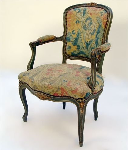 FRENCH BERGERE OPEN ARM CHAIR: Pegged construction, painted finish, needlepoint seat and back with cloth in rear of back. Please note the needlepoint is very old and has restoration work, the paint is worn. 34'' x 23'' x 19''.