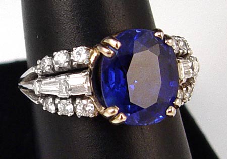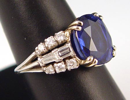 PLATINUM SAPPHIRE & DIAMOND RING: Platinum ring contains one oval shaped 7.36 Ct. synthetic sapphire, approx. 7.36 ct. Set with 12 round brilliant cut, 2 straight baguette cut and 2 tapered baguette cut diamonds. Weight: 1.00 Ct. Approx. Rated VS1 in clarity and G in color. The sapphire and diamonds are prong set. Weight: 7.6 grams. Size: 8 The sapphire is appraised by Schuler Gemological for $230. The setting and diamonds are appraised by Florida Diamond Appraisers for $4,300.