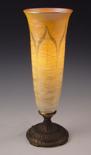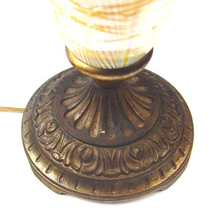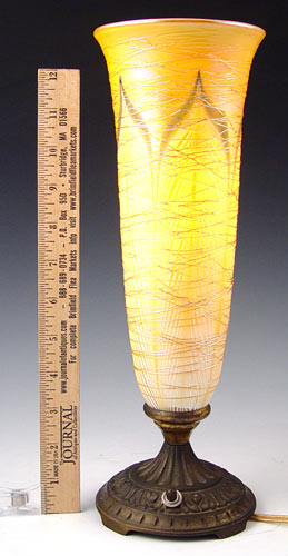 DURAND IRIDESCENT ART GLASS LAMP: Trumpet shaped Durand glass shade in a pulled thread design with overall applied threading. Original bronzed metal base. Measures 13'' high x 4 1/2'' at top rim. Very minor loss of threading, free of chips or cracks.