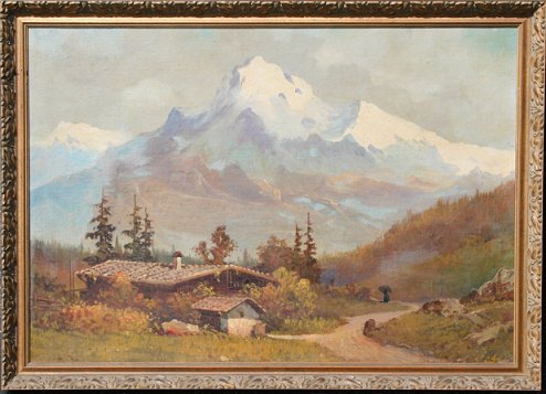 ALPINE LANDSCAPE WITH CHALET: OIL/C/B, unsigned, 30 1/2'' x 44'', framed, 34 1/2'' x 48''.