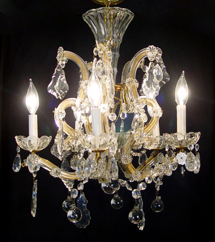 5 LIGHT CRYSTAL CHANDELIER: Diminutive chandelier with sparkling swags, shaped and ball prisms, five arms with single light to each, approx. 18'' ia., 20''h. plus chain. Please note missing a few flowers and prisms need shifted for symmetry.