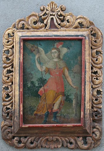 EARLY PAINTING OF THE ARCHANGEL RAPHAEL WITH FISH; Oil/Wood, 12 1/2'' x 8 1/2'' sight size, carved and painted wood frame with wear and repaint, 23'' x 15''. Some missing paint, needs cleaning. Est. $800/1200**