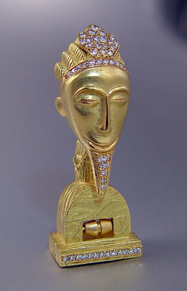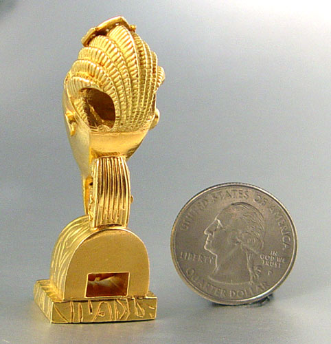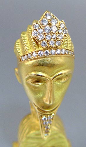 FRENCH 18K GOLD AND DIAMOND FIGURAL OBJECT D' ART / PENDANT: 18K yellow gold figure depicts a stylized ethnic idol. Contains 51 round brilliant cut diamonds. Weight: .85 Ct. Approx. The diamonds average VS in clarity and G-H in color and are deep set. Hallmark to back of head, Owl with 750 in the body. Figure stands on a pedestal. Can be worn as a pendant. Weight: 41.4 grams.