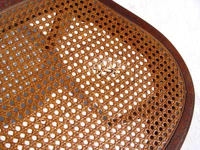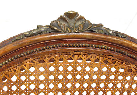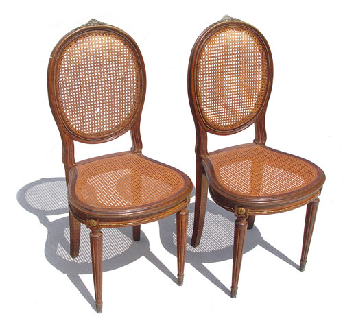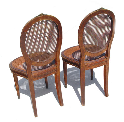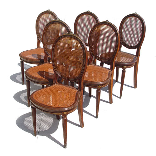 SET OF 6 19TH C FRENCH LOUIS XVI STYLE SIDE CHAIRS: Caned seats and backs, ormolu decorated, straight reeded legs. Note one shows damage on back of rail. Measure 38'' high x 17 3/4'' wide x 17 1/2'' deep.