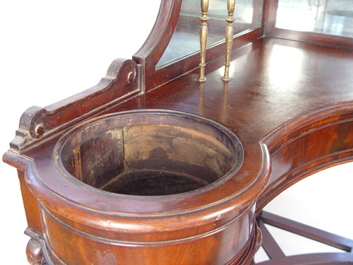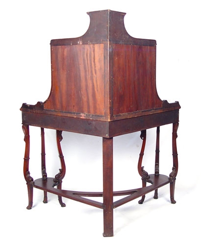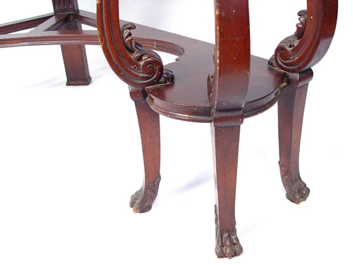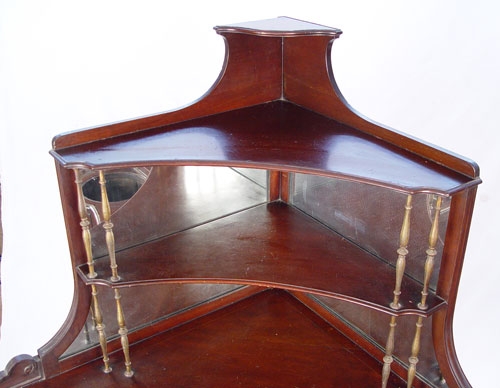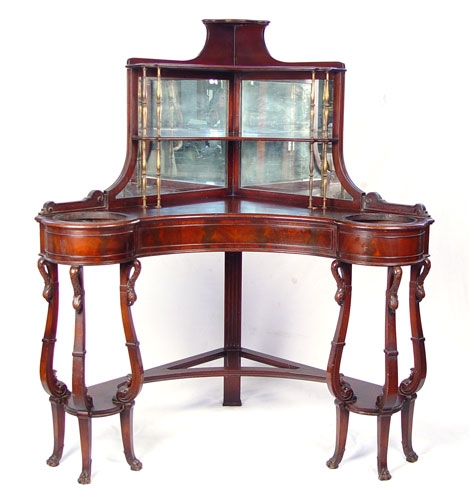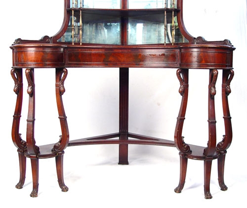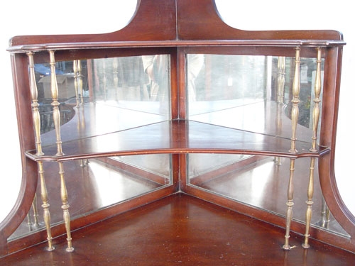 LATE 19TH C MAHOGANY ETAGERE: Mirror back tiered stand with a ferner in each of the front corners. Carved eagle head leg supports. Joints will need tightening. Measures 62 1/2'' high x 39'' wide each side x 31'' deep.
